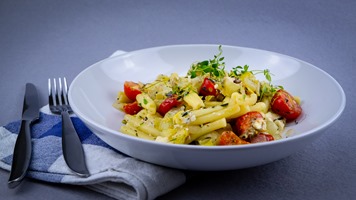 | 750 g Chicorée 140 g Radicchio 60 g Lauch 600 g Topinambur 160 g Möhren 80 g Knollensellerie 5 Zwiebeln 3 rote Spitzpaprika (ca. 360g) 20 g Basilikum, (ca. 8 Stiele) 400 g Cocktailtomaten 5 Knoblauchzehen 1 rote Chilischote 1/2 Bund Thymian 1 Bund glatte Petersilie 1 Zitronen | 80g Risoni-Nudeln 200 g Bulgur 1 kleine Dose stückige Tomaten, (ca. 240 g) 400 g kurze Pasta (z.B. Strozzapreti) 100 g Mehl 2 Eier, (Kl. M) 80 g Butter 125 ml Milch 250 g Joghurt 400 g Feta 2 Tl Schwarzkümmel 30 g Mandelblättchen 1 Laugenbrötchen |